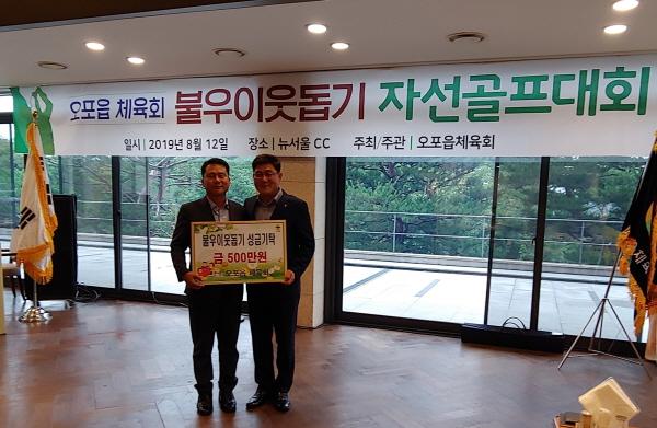 이날 기탁금은 오포읍체육회가 뉴서울 컨트리클럽에서 자선골프대회를 개최하고 모인 성금을 관내 복지사각지대에 있는 소외된 이웃들을 위해 전달한 것으로 그 의미를 더했다.