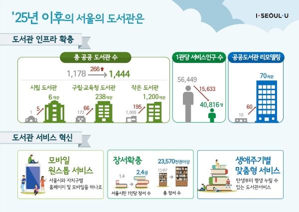 마지막으로, 도서관 서비스도 혁신한다. 하나의 앱으로 시립·구립·교육청 도서관 자료를 검색·대출하는 ‘모바일 도서관’ 서비스를 새롭게 시작하고 25개 자치구별 1개 공공도서관을 ‘정보취약계층 지원센터’로 운영하는 등 도서관 이용 문턱을 낮추고, 생애주기별 맞춤 프로그램도 본격화한다.