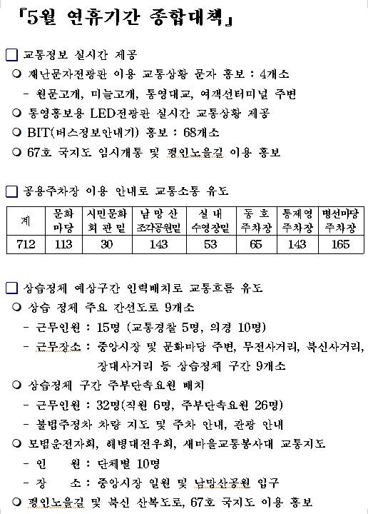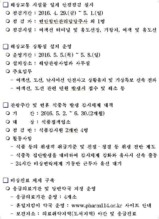 특히 5월 6일 임시공휴일 지정에 따른 민원 최소화를 위하여 중점 추진기간(5. 5. ~ 5. 8.)을 설정하고, 종합상황실을 설치하여 총괄반, 동향관리반, 생활민원 대책반, 관광대책반, 교통대책반, 해상교통대책반, 청소대책반, 재난대책반, 급수대책반, 보건대책반 등 분야별 10개 연132명이 상황근무에 임했다.