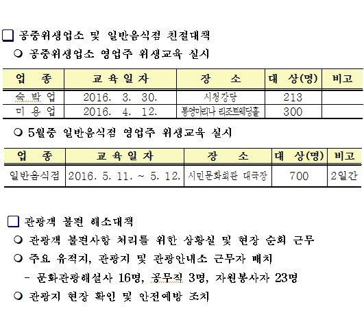 통영시는 2016년 봄 여행주간(5. 01.∼5. 14.) 및 어린이날 연휴, 석가탄신일 등 5월 가정의 달을 맞아 많은 관광객이 방문할 것으로 예상하고 관광객과 시민불편 해소를 위해 『5월 연휴기간 종합대책』을 마련하여 시행했다.