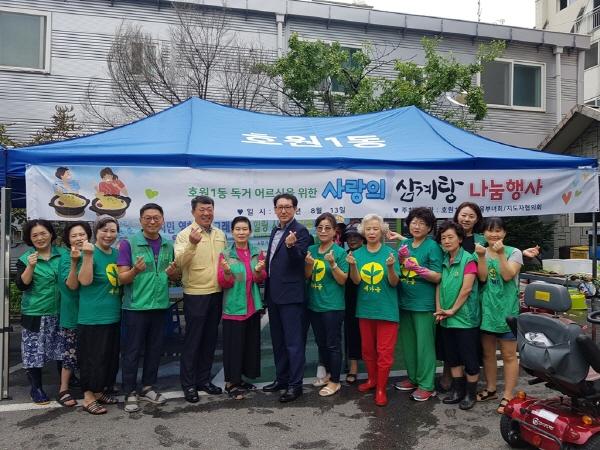 의정부시 호원1동 새마을부녀회는 13일 동 주민센터 앞마당에서 지역 내 독거 어르신들을 위한 ‘사랑의 삼계탕 나눔 행사’를 가졌다.
