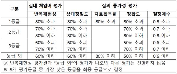 성능인증은 실내외 시험을 통해 반복재현성, 상대정밀도, 자료획득률, 정확도, 결정계수 등 5개 항목을 평가하며, 최종적으로 1~3등급, 등급외 등 총 4단계로 등급을 부여한다.