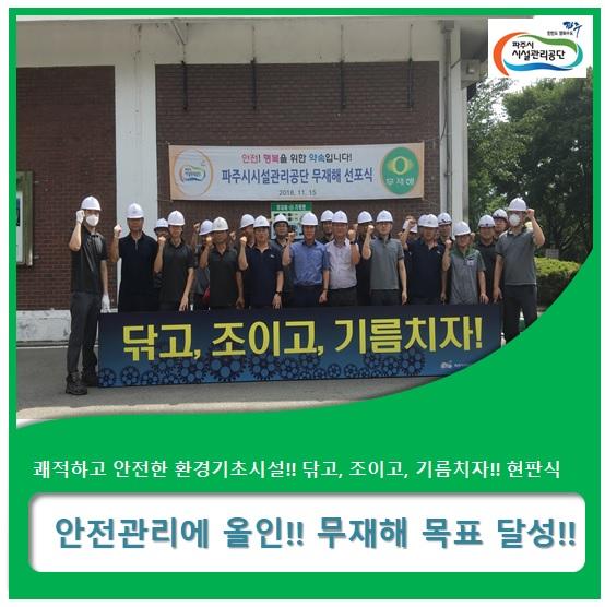 파주시시설관리공단은 지난 12일 파주시 환경기초시설인 환경순환센터에서 무재해 목표 0.5배수 달성을 기념하는 “닦고, 조이고, 기름치자” 현판식을 가졌다.