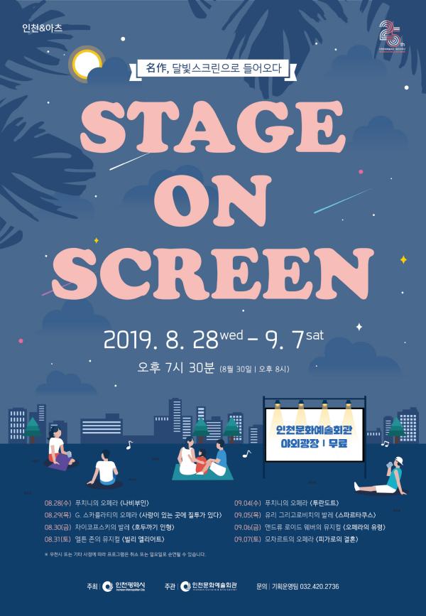 ‘스테이지 온 스크린’은 공연예술계의 최신 트렌드인 ‘스크린으로 즐기는 명작공연’이라는 컨셉 하에 2013년 처음 기획된 후, 시민들의 뜨거운 호응에 힘입어 올해로 7년차를 맞이하는 인천문화예술회관의 브랜드 공연이다. 2019년에도 더욱 재미있고 흥미로운 작품들이 라인업으로 이름을 올렸다. 그 이름만으로도 가슴 벅찬 새로운 오페라, 발레, 뮤지컬 등 총 8개 작품이 무료로 선보일 예정이다. 530인치의 대형 에어스크린과 광활한 사운드를 자랑하는 음향장비가 관객을 맞이한다.