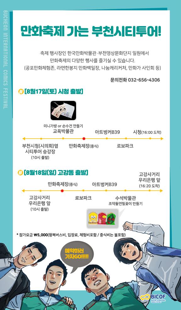 17일에는 교육박물관, 만화축제장, 아트벙커B39, 로보파크 순으로 둘러보며, 18일에는 만화축제장, 로보파크, 아트벙커B39, 수석박물관 순으로 투어를 하며 참가비는 5천 원이다.