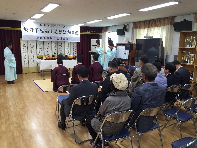 올 해에도 5월 16일(월)에 석다례를 봉행하기로 결정하고 초헌관으로 성명만 도천동장, 아헌관으로 안종기 도천동통장협의회장, 종헌관으로 박태주 밀양박씨종친회대표를 선정하여 도천동 바르게살기위원장(주재현)의 집례로 엄숙한 가운데 석다례를 봉행했다.