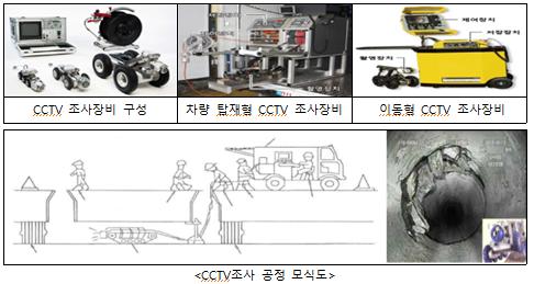 노후 하수관 정밀조사는 하수관에 폐쇄회로텔레비젼 조사장비를 투입한 후 지상에서 화면과 조작 장치를 이용하여 하수관 내부를 이동하면서 영상을 촬영하는 방식으로 수행된다.