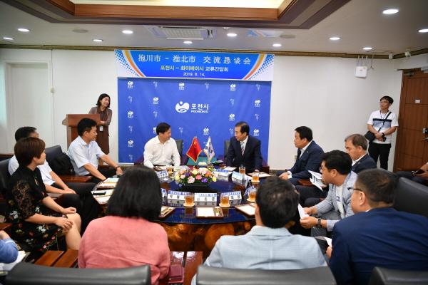 이날 포천시청 브리핑룸에서 진행된 양 도시 교류간담회에는 중국공산당 화이베이시위원회 조직부 런동 부장을 비롯한 대표단 일행 4명과 박윤국 포천시장, 조용춘 포천시의회 의장, 김우석, 이원웅 경기도의회 의원, 연제창 포천시의회 운영위원장, 임종훈, 박혜옥 포천시의회 의원 등 10여 명이 참석했다.