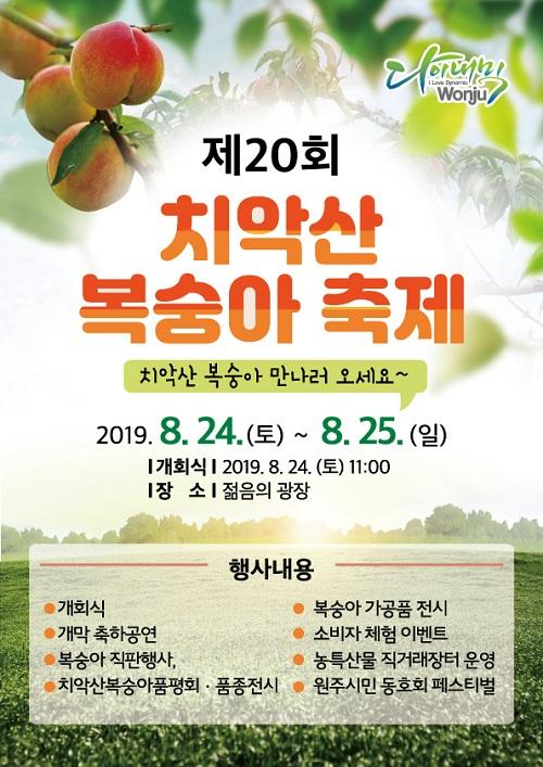 전국 최고의 맛과 명성을 자랑하는 제20회 치악산 복숭아 축제가 오는 8월 24일부터 25일까지 이틀 동안 원주시 명륜동 젊음의 광장에서 개최된다.