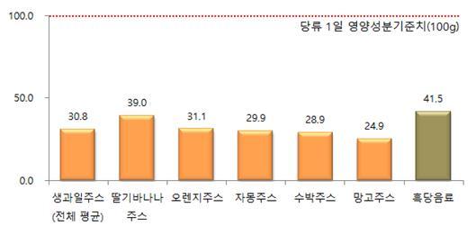 생과일주스 종류별 100g당 당류 함량은 딸기바나나주스가 가장 많고, 오렌지주스 "자몽주스 "수박주스 "망고주스 순으로, 딸기바나나주스가 망고주스보다 1.6배 높다.