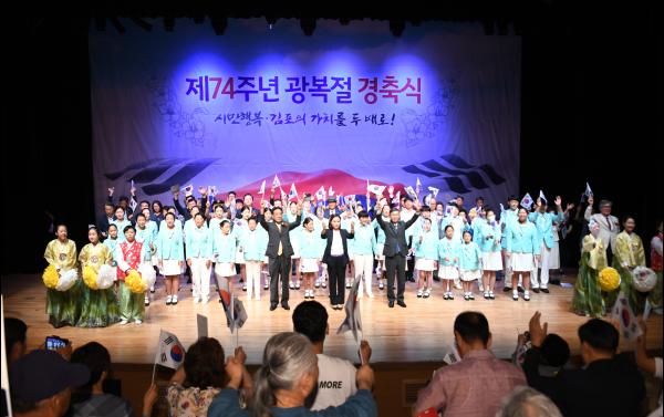 김포시는 지난 15일 김포아트홀에서 정하영 김포시장, 강성보 광복회 김포시지회장을 비롯해 광복회원과 유가족 및 기관단체장, 시민 등 500여 명이 참석한 가운데 ‘제74주년 광복절 경축식’을 개최했다.