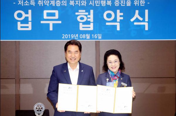 백군기 용인시장은 16일 시장실에서 신해진 국제로타리 3600지구 총재와 관내 저소득 취약계층의 복지와 시민행복 증진을 위한 업무협약을 체결했다.