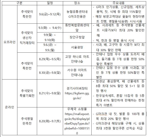 이 외에도 9월 3일 화성시 동탄복합문화센터를 시작으로, 수원시 장안구청, 서울시 서울광장 등 직거래 장터에서 축산, 과일류, 홍삼 등 추석에 선물하기 좋은 다양한 농특산물과 명절 성수품 등을 시중가보다 최대 30%까지 저렴한 가격에 구입할 수 있다.