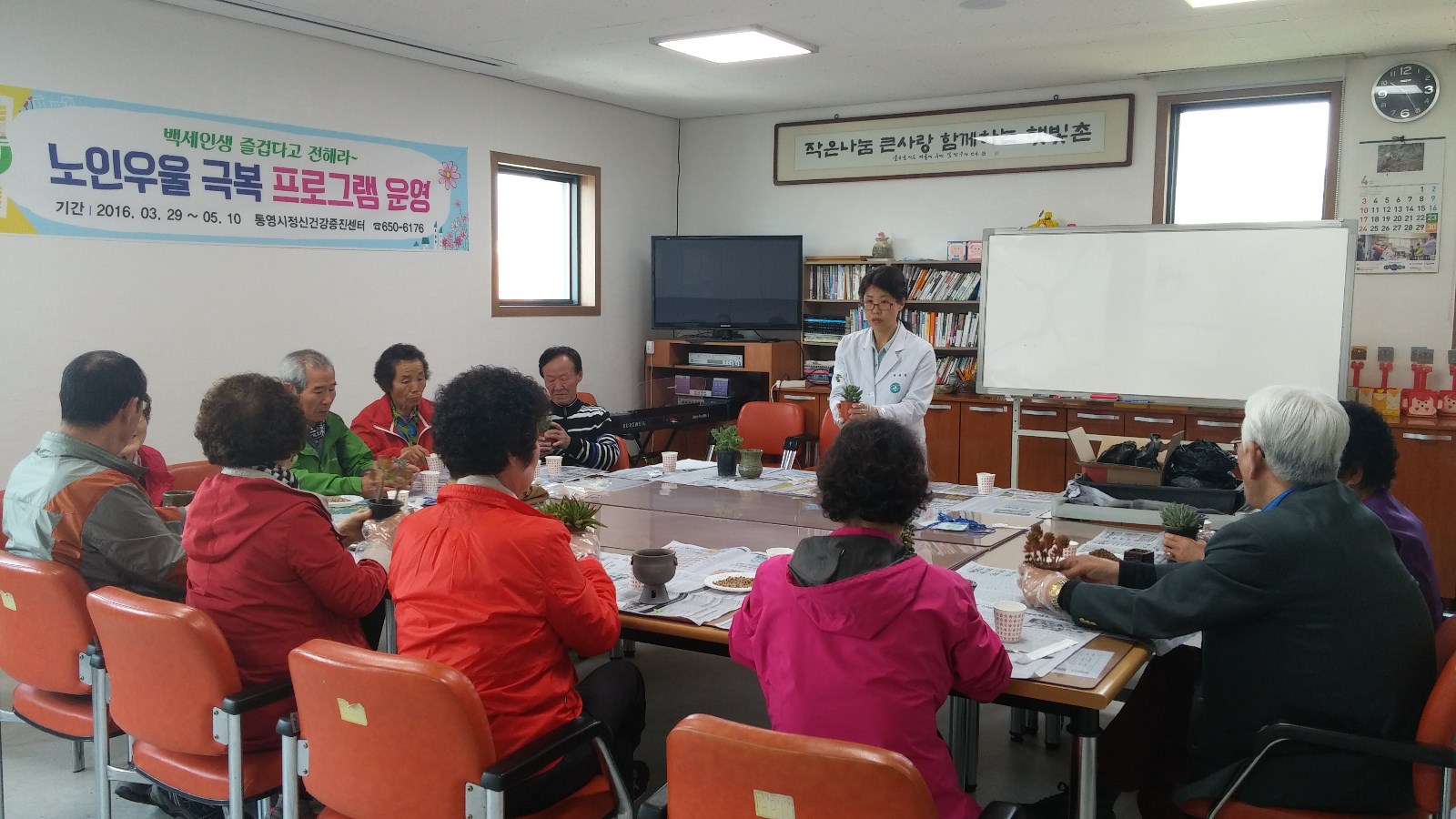 통영시보건소 정신건강증진센터는 2015년 9월 우울증 어르신 10명을 대상으로「우울증은 가go, 즐거움은 오go」라는 슬로건으로 1기 프로그램을 운영하였으며 이번 수료식에는 1기와 2기 어르신들의 만남의 시간을 가져 큰 호응을 얻었다.