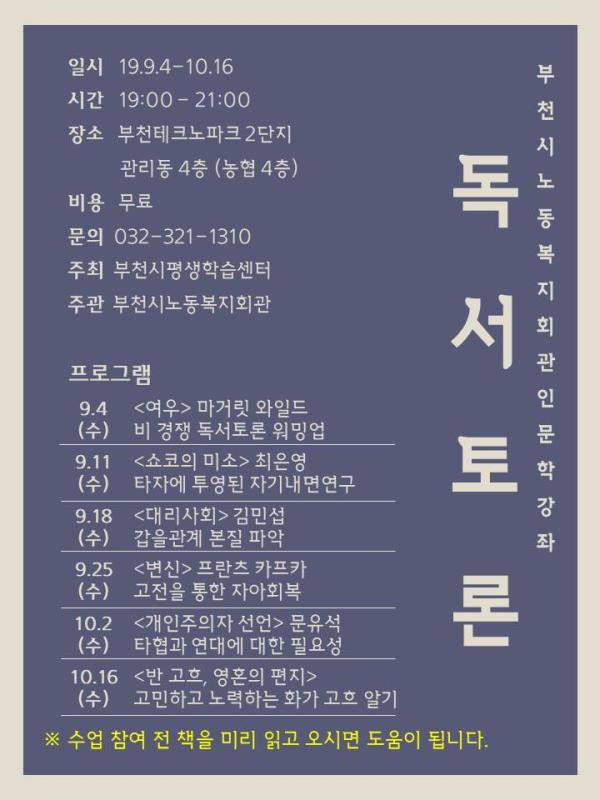 천시노동복지회관 노동복지테크노파크사무소에서는 오는 9월 4일부터 10월 16일까지 총 6주 동안 부천테크노파크 2단지에서 노동자 및 지역주민들 대상으로 다양한 주제의 책 읽기를 통한 “독서토론 강좌”를 진행한다.