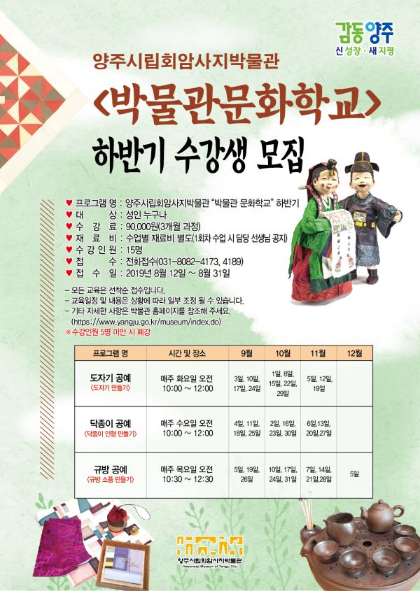 양주시립회암사지박물관은 오는 9월 3일부터 양주시민과 경기북부 성인의 문화생활 증진을 위한 ‘2019, 박물관 문화학교’ 하반기 강좌를 운영한다.