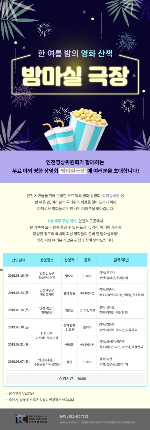 이번에 상영되는 영화는 선착순 무료로 관람 가능하시며 돗자리 등은 개인이 지참해야 하고, 상영에 관한 문의는 인천영상위원회로 하면 된다.