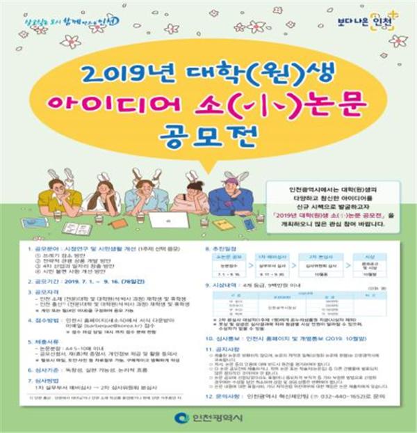 인천시는 대학생 및 대학원생의 다양하고 참신한 아이디어를 신규 시책으로 발굴하여 이를 시정에 즉각 반영해 시민과 함께 살고 싶은 도시 인천을 실현하고자 ‘2019년 대학생 아이디어 소논문 공모전’을 오는 9월 16일까지 개최한다고 밝혔다.