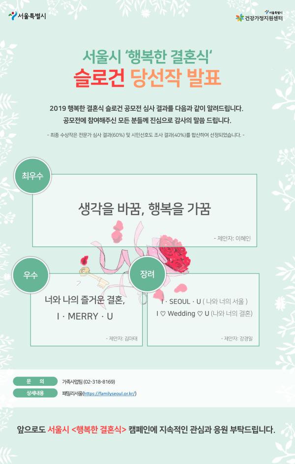 서울시가 주최하고 서울시건강가정지원센터가 주관한 ‘행복한 결혼식’ 슬로건 공모전 최우수 수상작으로 17세 학생이 제안한 ‘생각을 바꿈, 행복을 가꿈’이 선정됐다.