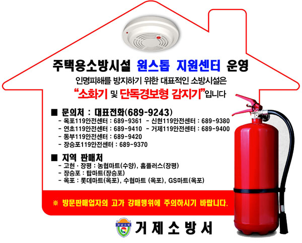 자세한 문의는 거제소방서 주택용 소방시설 원스톱 지원센터(대표689-9243)로 문의하면 된다.