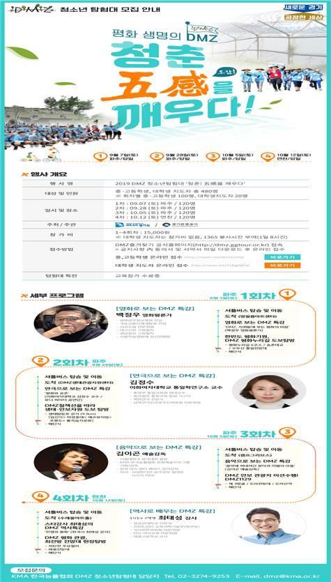 영화, 연극, 음악, 역사 등 각계각층의 전문가들과 함께 DMZ 일원을 돌아보며 평화의 의미를 되새겨보는 ‘DMZ 청소년탐험대 특별 프로그램 ‘평화 생명의 DMZ 청춘 오감을 깨우다’’이 올 가을 개최된다.