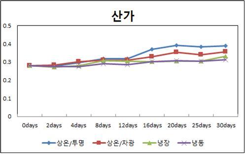 조사 결과, ‘산가’는 보관방법 별로 큰 차이를 보이지 않았으나, ‘과산화물가’의 경우 1주일을 기점으로 보관방법에 따라 차이를 보였다.