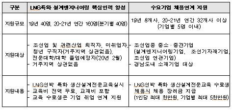 LNG특화 설계엔지니어링 핵심인력 양성사업은 LNG 선박 및 LNG 기자재 생산설계 전문 교육 사업이며, 거주지역에 상관없이, 조선업 및 관련산업 퇴직자, 미취업자, 청년 구직자, 전문대학/대학 졸업예정자를 대상으로 하며, 교육비는 전액 무료로 제공 된다.