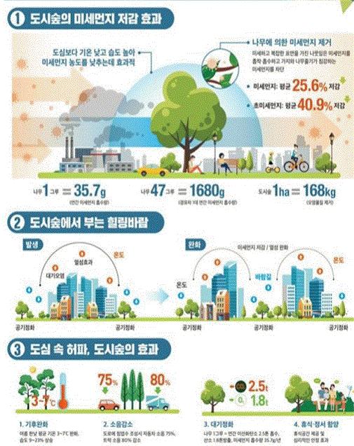 숲은 도심의 온도를 낮추는 것뿐만 아니라 미세먼지를 25.6% 낮추는 기능을 가지고 있어 노후 산업단지 인근 도시숲 조성에 투자하여 도심 온도 낮추기와 미세먼지 낮추기라는 두 마리 토끼를 모두 잡고자 한다.