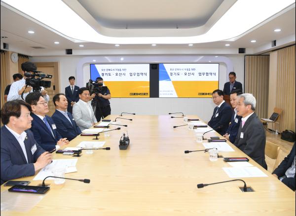 이날 협약식에는 협약 당사자로 이재명 경기도지사와 곽상욱 오산시장이 참석하여 협약서에 서명을 하고, 조재훈 경기도의회 건설교통위원회 위원장, 송영만 경기도의회 경제과학기술위원과 조요한 오산문화재단 상임이사 및 오산시 문화도시추진준비위원장으로 활동하고 있는 이동렬 중앙대 교수가 함께 참석하여 자리를 더욱 뜻깊게 했다.