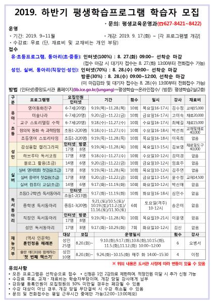 모집 강좌는 유아 대상 ‘영어동화친구’, ‘미술나라’, ‘교구 스토리텔링 수학’, 초등학생 대상 ‘창의쑥 동화속 과학탐험’, ‘초등영어스토리타임’, 성인 대상 ‘감성융합 캘리그라피’, ‘하브루타 독서코칭’, ‘블로그 활용’ 실버 대상 ‘실버 영어회화 첫걸음’, ‘실버 중국어 첫걸음’, ‘실버 컴퓨터교실’, 독서동아리 ‘초등독서동아리’, ‘중학생독서동아리’, ‘직장인 독서동아리’,‘성인 독서동아리’로 총 15개 정규 프로그램이 있다.