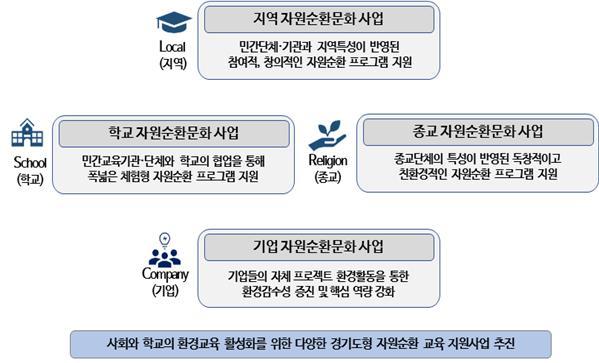 또한, 자원순환 관련 다양한 사업을 연계해서 ‘경기도 자원순환문화 조성사업’을 구상하고 학교, 지역, 기업, 종교 등 4개 활동분야로 구분하여 특성화된 조성사업을 추진하는 방안이 필요하다.