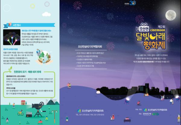올해로 2회째를 맞는 오산천 달빛아래 영화제는 작년 시민들의 큰 호응에 힘입어 올해는 영화상영 뿐 아니라 나만의 LED부채만들기, 오산천 영상물 상영, 문화공연 등 더욱 다양한 콘텐츠를 가지고 도심 속 지친 현대인들의 심신을 힐링해 줄 영화제를 개최한다.