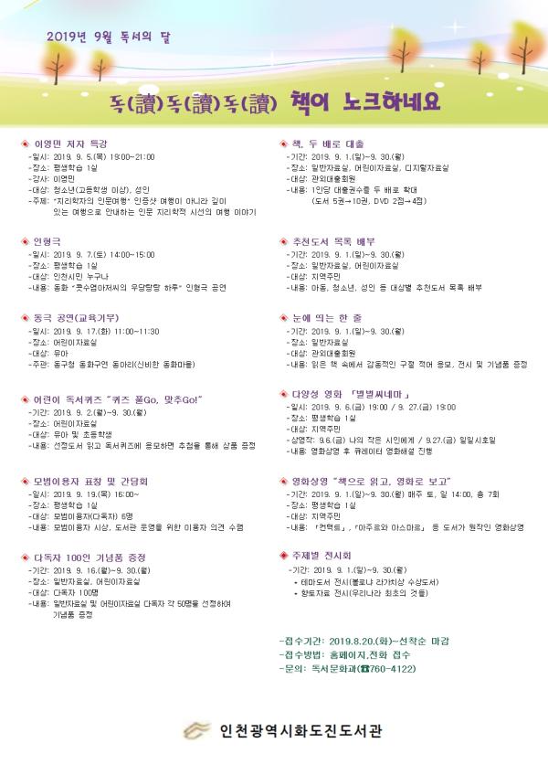 인천광역시화도진도서관에서는 9월 ‘독서의 달’을 맞이하여 지역주민의 독서의욕 고취 및 문화향유기회 제공을 위하여 “독독독 책이 노크하네요”를 주제로 다양한 독서문화프로그램을 운영한다.
