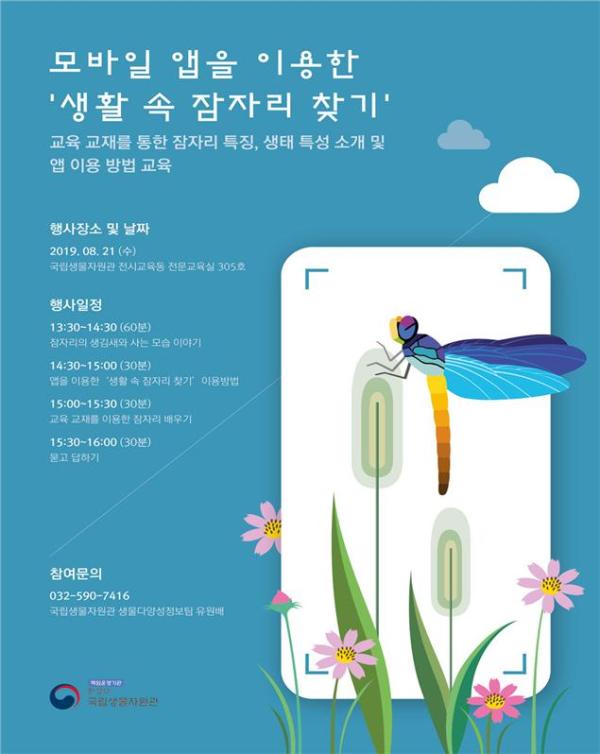 환경부 소속 국립생물자원관은 ‘생활 속 곤충 찾기 모바일 앱을 활용한 우리나라 잠자리 찾기’ 행사를 8월 21일 인천 서구 국립생물자원관에서 갖는다.