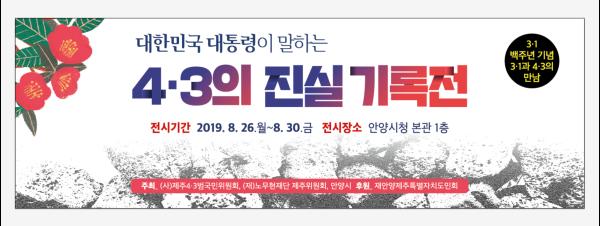 안양시는 제주4·3범국민위원회·노무현재단제주위원회와 공동으로 오는 26일부터 30일까지 청사본관 1층 로비에서“대한민국 대통령이 말하는 4·3의 진실 기록전”을 개최한다고 밝혔다.