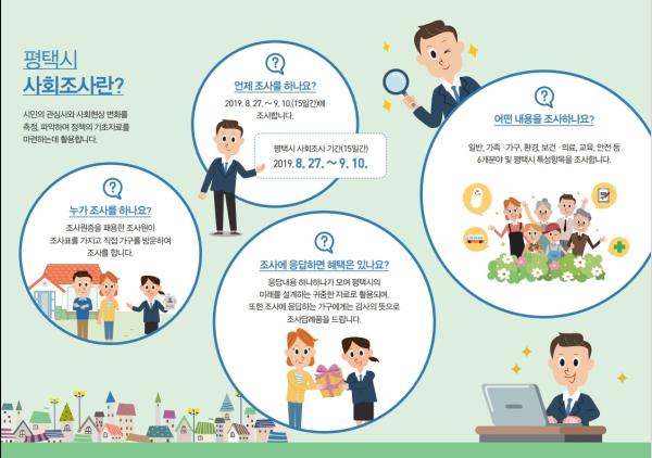 평택시는 지역개발 및 복지시책 추진을 위한 시정의 정책자료로 활용하기 위해 오는 27일부터 9월 10일까지 15일간 ‘2019년 평택시 사회조사’를 실시한다.