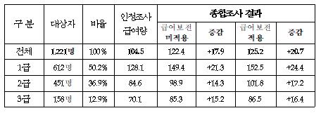 기존 수급자 중 수급자격 갱신기간이 도래하여 종합조사를 실시한 1,221명의 급여변화를 분석한 결과, 이 중 79.8%가 급여량이 증가하고, 19.2%는 급여량이 유지되며, 1.0%는 급여량이 감소하는 것으로 나타났다.