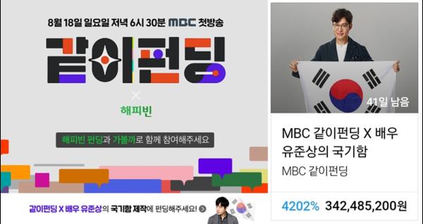 22일 MBC ‘같이 펀딩’ 측은 “오는 25일 방송되는 ‘같이 펀딩’ 2회 방송 진행 중 유준상의 국기함 2차 펀딩을 시작한다”라고 전했다.