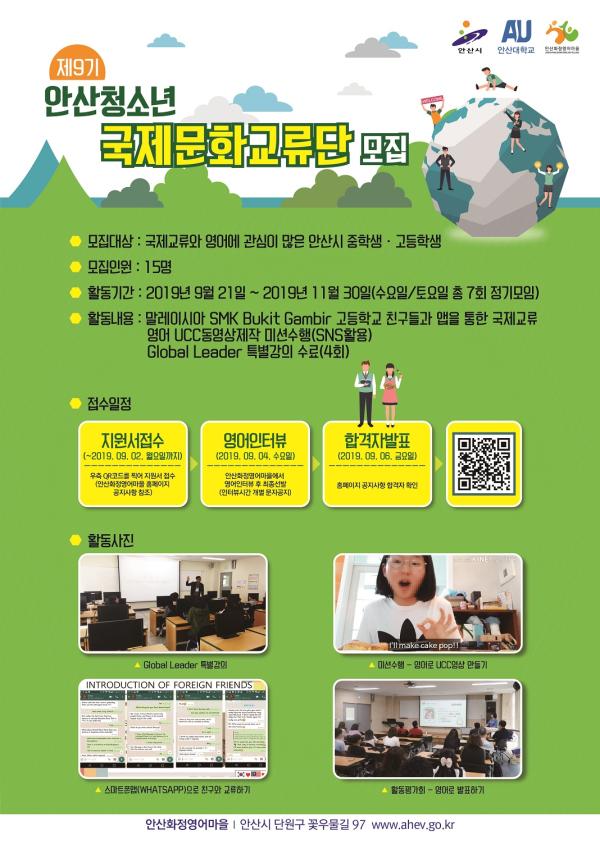 ‘안산청소년 국제문화교류단’은 안산을 알리는 UCC제작, 글로벌 직업체험강의 수강, 학생들의 아이디어를 담아 각 나라의 문화를 엿볼 수 있는 선물교환 등 다양한 활동을 통해 외국학생들과 교류하며 학생들의 영어 학습 동기를 부여해 미래 글로벌 리더로 성장할 수 있도록 하는 안산화정영어마을의 국제교류 프로그램이다.