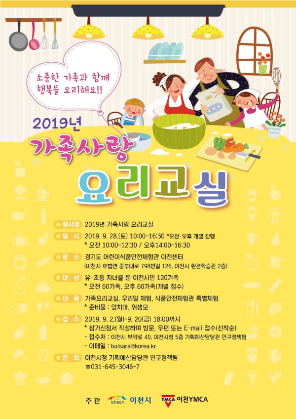 이천시는 오는 9월 28일 경기도 어린이식품안전체험관 이천센터에서 이천시민 가족을 대상으로 ‘2019년 가족사랑 요리교실’을 개최한다고 밝혔다.