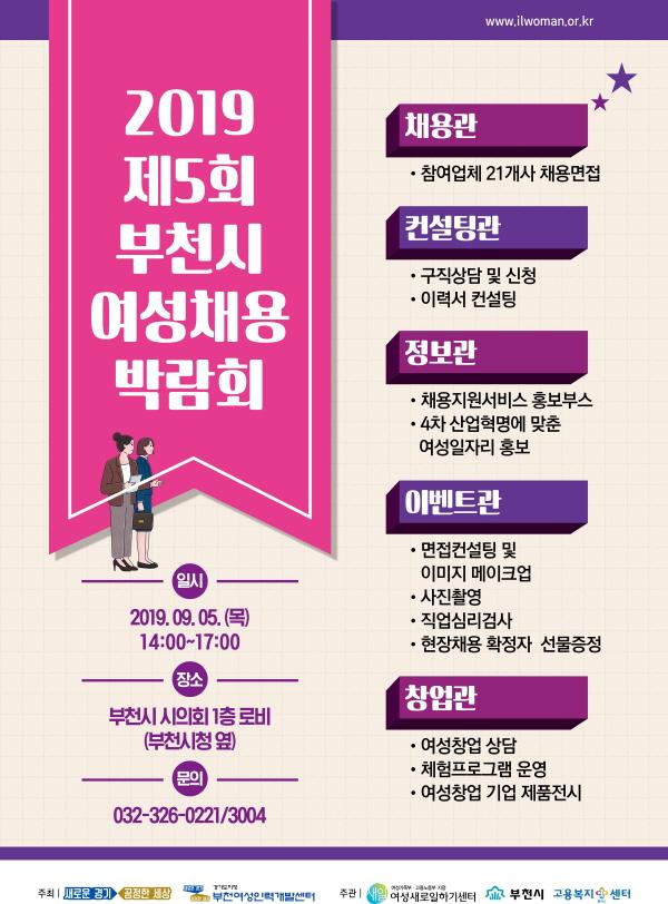 부천시는 내달 5일 오후 2시부터 5시까지 부천시의회 1층 로비에서 ‘제5회 부천시 여성채용박람회’를 개최한다고 22일 밝혔다.