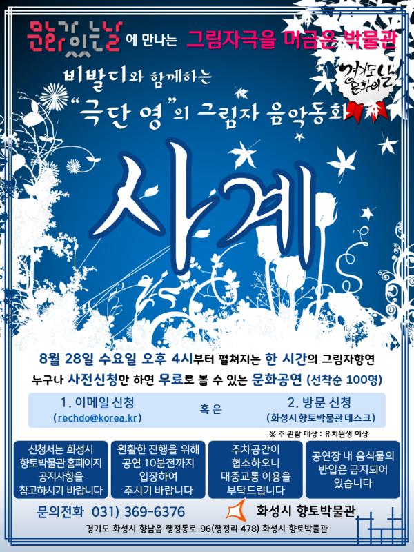 화성시민의 문화향유 기회를 확대하고 화성시 향토박물관 인지도를 강화하기 위해 마련된 이번 이벤트는 오는 8월 28일 그림자극 ‘사계’를 시작으로 9월 25일, 10월 30일, 11월 27일 공연까지 총 4회에 걸친 공연 중 3회 이상 관람 후기 인증 스탬프를 받으면 선착순 20명에 한해 무선충전마우스패드 또는 보조배터리 기념품을 받을 수 있다.