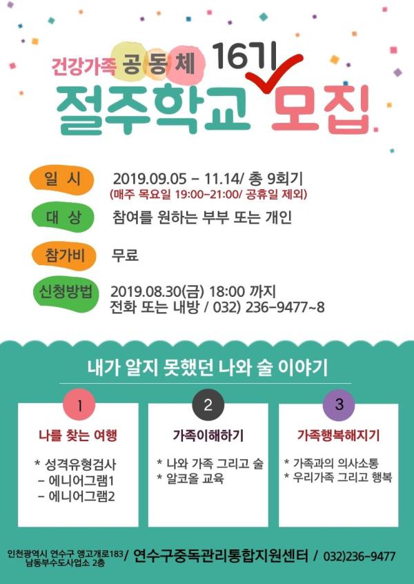 연수구는 알코올 문제에 대한 교육을 통해 음주 폐해의 심각성을 알고, 알코올에 대한 올바른 인식과 책임 있는 음주문화를 조성하고자 ‘건강가족공동체-절주학교’프로그램을 운영한다.