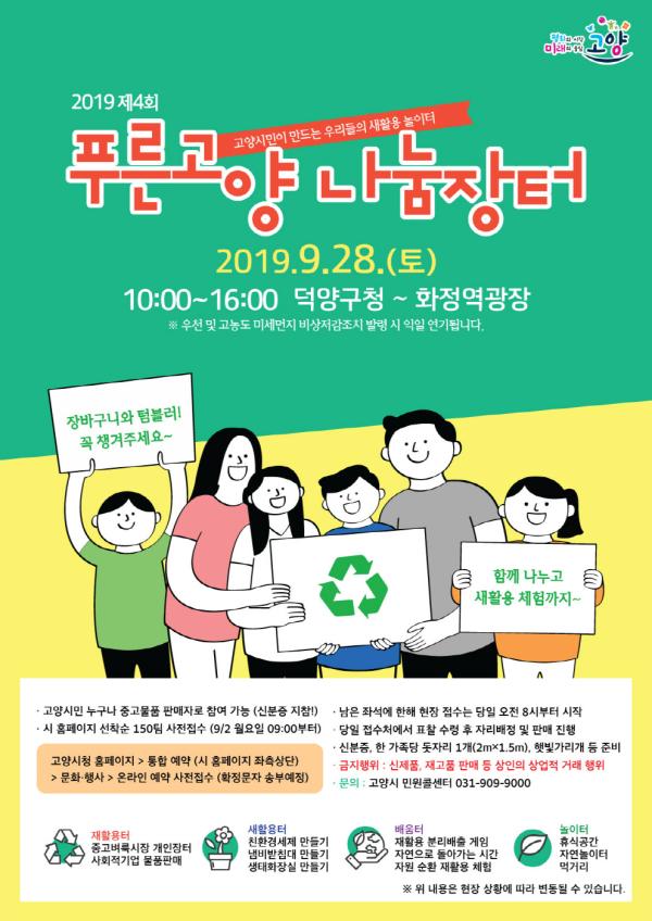 고양시 덕양구는 오는 9월 28일 오전 10시부터 오후 4시까지 덕양구청에서 제4회 푸른고양 나눔장터를 개최한다.
