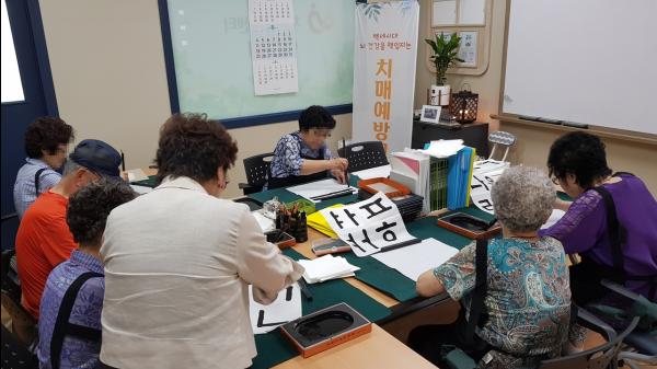 8월 20일 송산 치매안심센터에서 진행된 치매예방교실 프로그램에서는 치매예방수칙 ‘3·3·3’을 통해 잘못된 생활습관을 개선하고 건강한 생활습관 형성을 위한 교육과 함께 어르신들이 직접 붓으로 자신의 이름을 써보는 서예교실을 진행했다.