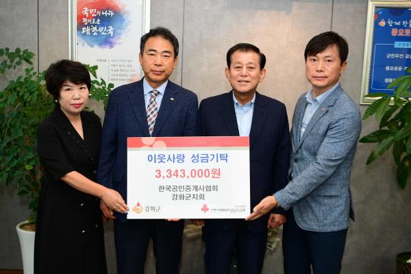 한국공인중개사협회 강화군지회가 지난 21일 이웃돕기 성금 334만 3천 원을 강화군에 기탁해 어려운 이웃에게 훈훈한 마음을 전했다.