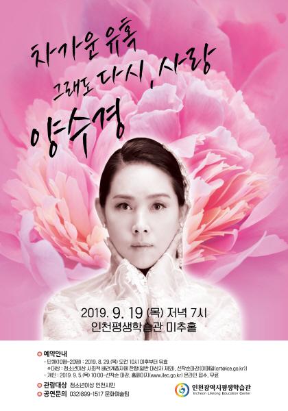 인천평생학습관은 오는 9월 19일 저녁 7시 미추홀에서 “차가운 유혹, 그래도 다시 ‘사랑’ 양수경” 콘서트를 개최한다고 밝혔다.