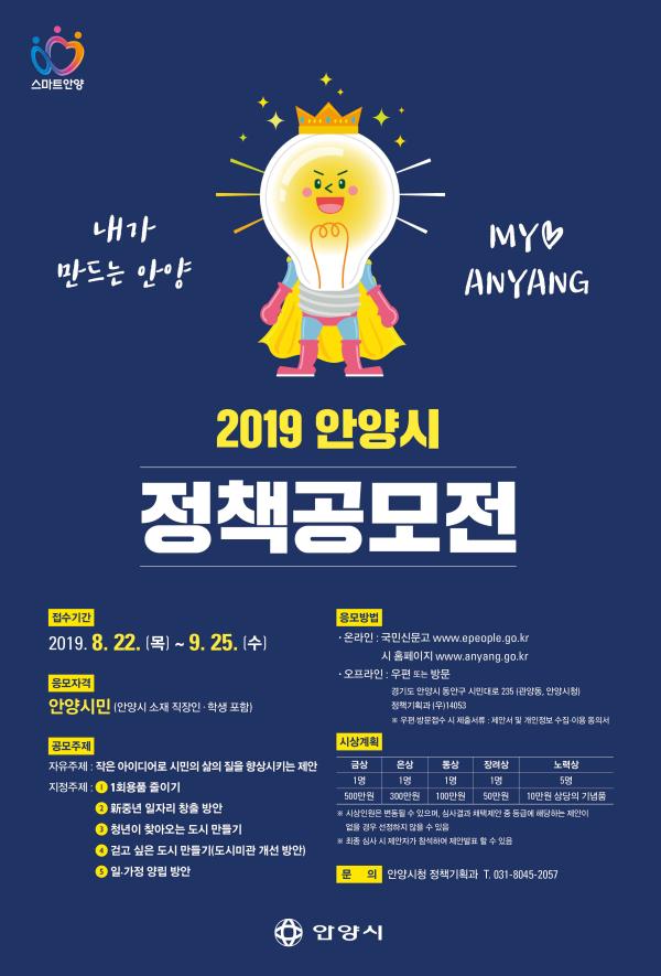 안양시가 시민의 창의적인 아이디어를 시정에 반영하기 위한‘2019 안양시 정책공모전’을 연다.