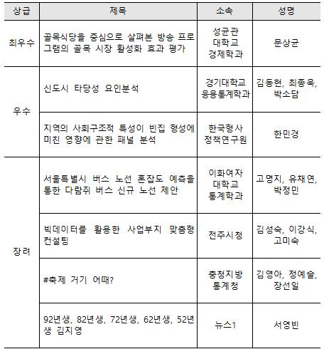 통계청은 정부혁신의 일환으로 국민이 데이터를 자유롭게 활용하는 기반 확산을 위하여 실시한 “제1회 통계빅데이터 분석 활용 대회” 수상작을 선정, 발표했다.