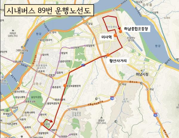 시내버스 89번은 미사강변도시 주차장13부지에서 출발하여 미사강변중학교, 아이테코, 황산사거리, 중앙보훈병원역을 거쳐 오금역을 연계하는 노선이다.